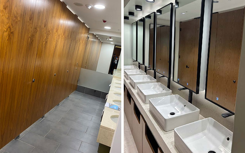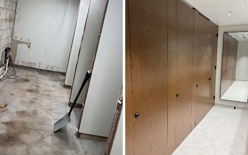 A full site set-up was established, including the safe implementation of service isolations to create secure working conditions. Zenith’s operatives removed and responsibly disposed of all existing sanitaryware, cubicle doors, IPS panels, ceilings, and floor finishes. The existing cubicle walls were retained for reuse within the new design.