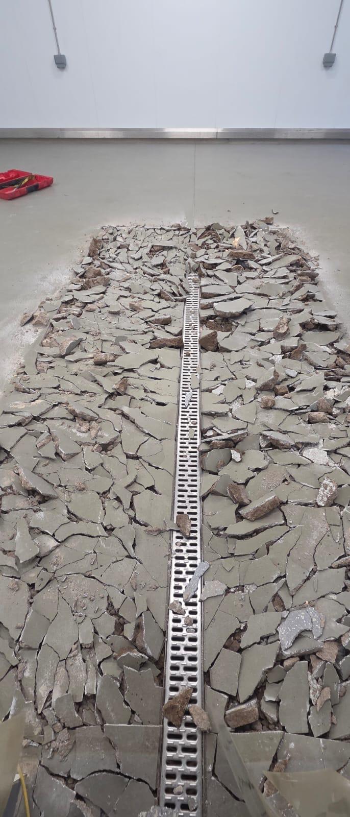 Following perimeter saw cutting, the existing floor was broken out to a depth of approximately 75mm to form rebated areas. A new cementitious screed was then installed to create consistent falls of 1:100 towards the central stainless steel drains.