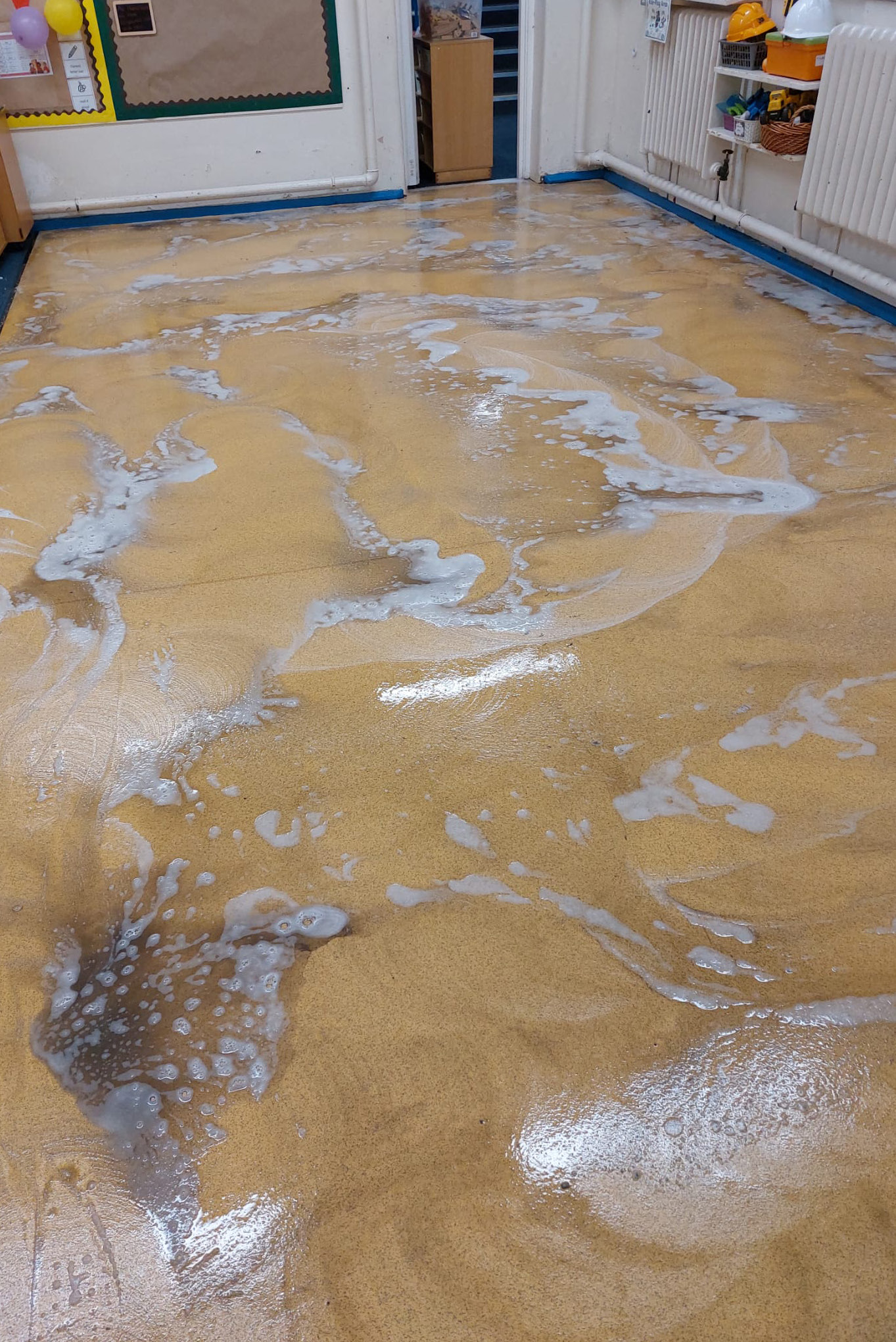 Using a pedestrian scrubber dryer, the Zenith team carried out an intensive cleaning process across the affected floor areas. Furniture and fixtures were carefully moved where necessary to allow full access to the floors, ensuring that every section could be properly cleaned and restored.